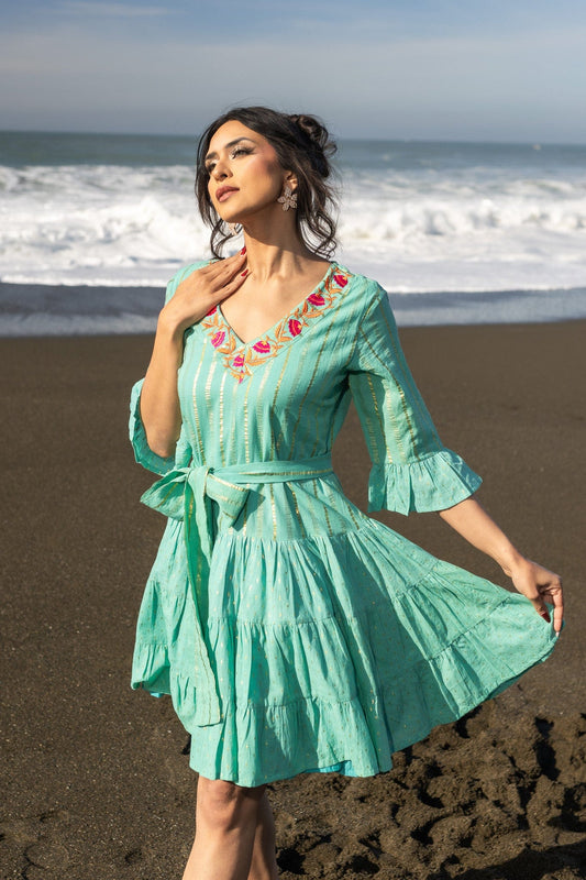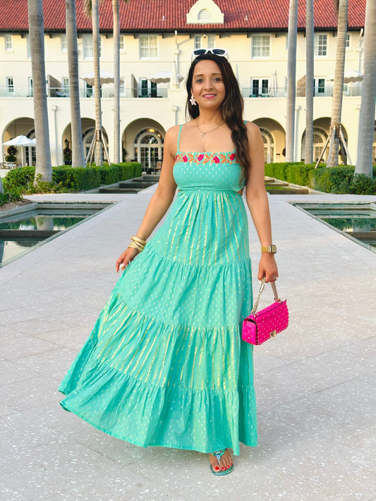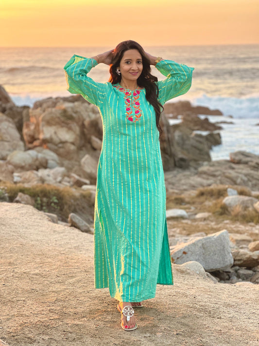 When sunlight dances across the fabric, these elegant 100% cotton dresses with golden lurex accents and delicate embroidery shimmer beautifully.