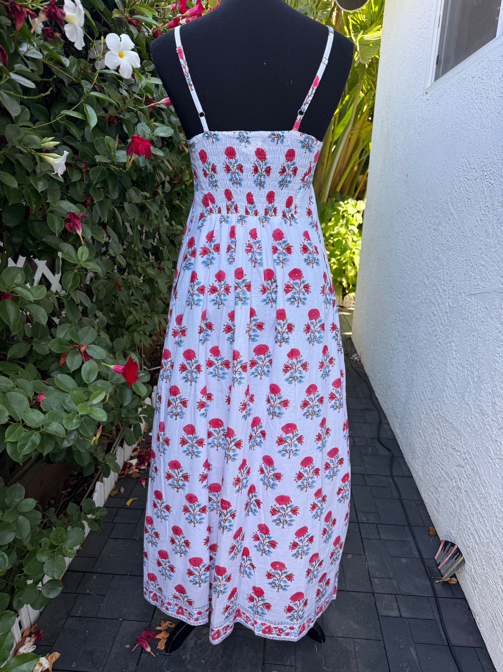 The Ashley dress in Floricana Flamingo hand block print on dobby cotton comes with adjustable straps, side pockets and smocking on the back.